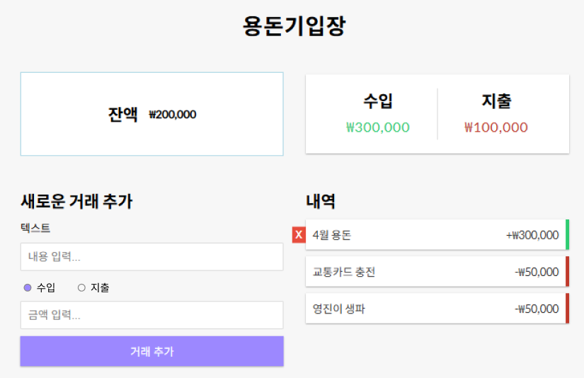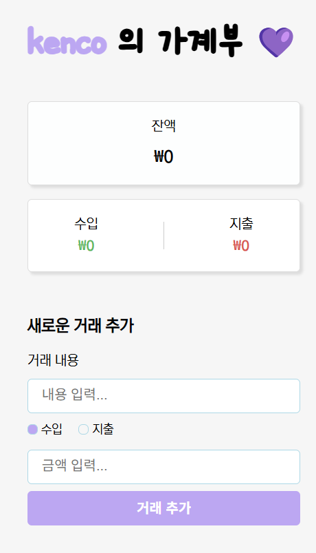수입과 지출을 기록하고 잔액을 관리할 수 있는 웹 애플리케이션으로, 모든 데이터는 브라우저의 로컬 스토리지에 저장된다.
